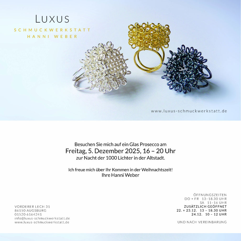 Sie können im Laden auch anderen, von mir entworfenen, handgearbeiteten Schmuck sowie Verlobungsringe und Eheringe finden.